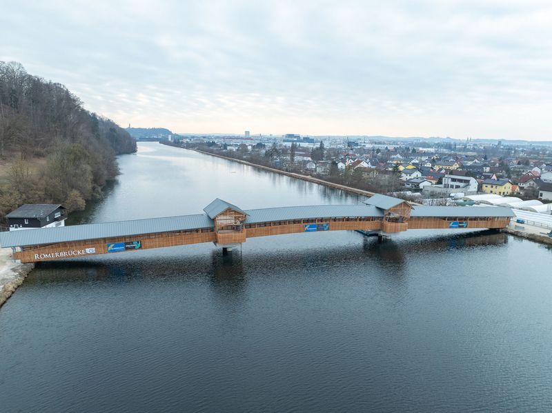 Die Brückenelemente, bestehend aus einer Fachwerkkonstruktion aus Holz, wurden durch den Arge-Partner gefertigt. Die sechs Fachwerkträger mit je 40 Metern Länge und 12 Tonnen Gewicht wurden aus dem Mühlviertel nach Wels transportiert. Vor Ort wurden diese Segmente auf einem Vormontageplatz zu drei Brückenfeldern zusammengefügt – jedes 40 Meter lang, sechs Meter hoch und bis zu 80 Tonnen schwer.