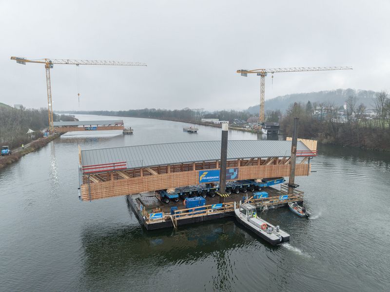 Der spektakulärste Teil des Projekts war das Einschwimmen der Brückenfelder. Mit den „Self-Propelled Modular Transporters“, kurz SPMT genannt, wurden die fertig montierten Elemente auf eine speziell errichtete Rampe gefahren und auf ein Schwerlastponton verladen. Die Präzision dieses Vorgangs war beeindruckend: Mit gezielter Ballastierung durch Wasserein- und -auslass wurde das Ponton feinjustiert. Somit konnten die Brückenelemente punktgenau auf die Widerlager an den Ufern und auf die Stützpfeiler gesetzt werden.